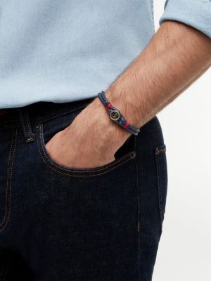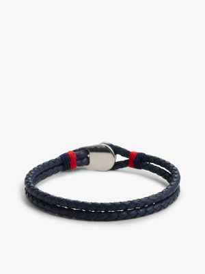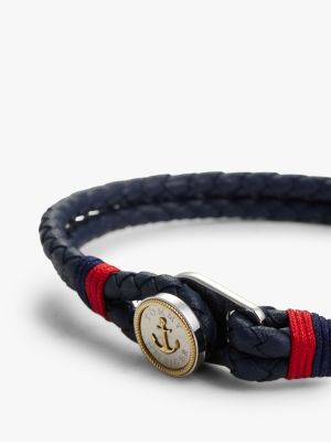 Dieses blaue Lederarmband mit doppeltem, geflochtenem Riemen und klassischen maritimen Details setzt auffällige Akzente am Handgelenk.