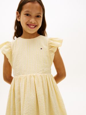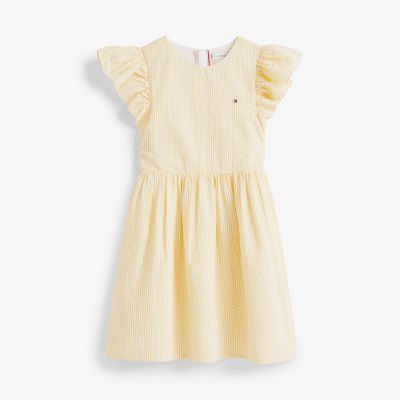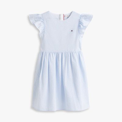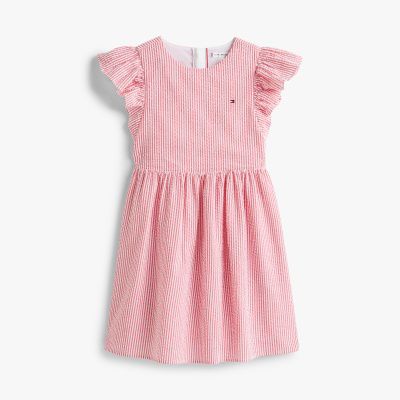Dieses verspielte Fit-and-Flare-Kleid begeistert mit luftigem Seersucker aus reiner Baumwolle, dezentem Streifen-Design und kurzen Rüschenärmeln.