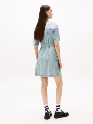 Dieses Denim-Kleid punktet mit einem klassischen Trucker-Style und zwei Brusttaschen, während der Gürtel die Taille betont.