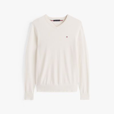 Bring durch diesen Pullover aus reiner gekämmter Baumwolle mit V-Ausschnitt und Flag-Stickerei elegantes Flair in deine Lagenlooks.