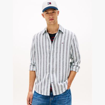 Ein luftiger Leinen-Baumwollmix macht dieses Hemd perfekt für warme Tage, während die vertikalen Streifen an klassische Anzüge erinnern.