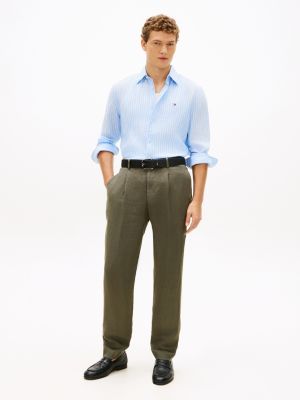 Perfekt für warme Tage ist dieses zeitlose Premium-Popeline-Hemd aus reinem Leinen mit eleganten Bengal-Streifen und Button-down-Kragen.