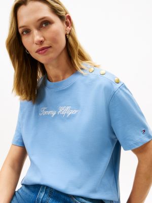 Auffällige goldfarbene Knöpfe an der Schulter verleihen diesem Relaxed Fit T-Shirt mit Rundhalsausschnitt und Logo-Stickerei einen edlen Vibe.