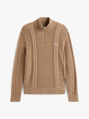 Der Viertel-Reißverschluss am Ausschnitt verleiht diesem klassischen Zopfstrick-Pullover einen aktuellen, sportlichen Vibe.