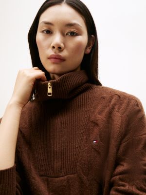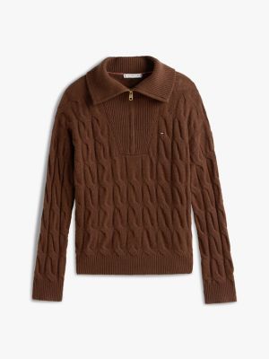 Zopfstrick-Wollpullover mit Viertelreißverschluss