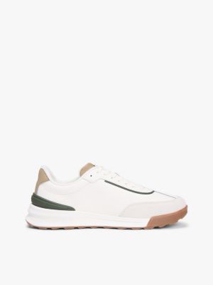 La tendance des baskets rétro devient luxueuse grâce à ce modèle en cuir enduit doté de quartiers contrastés et d'une semelle épaisse.