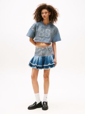 Confectionnée en denim délavé avec un effet usé, cette minijupe hybride à volants est rehaussée par des empiècements en cuir souple perforés qui lui donnent une allure ultra-féminine.